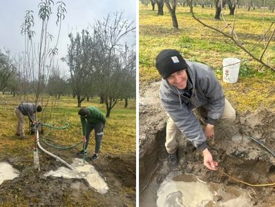 The image shows root measurements conducted in the almond orchard after the roots were uncovered and cleared.